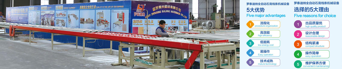 臨沂周興建材(玉興機(jī)械)有限公司始建于2001年7月,專(zhuān)業(yè)研發(fā)、生產(chǎn)全自動(dòng)鋁蜂窩板生產(chǎn)線,全自動(dòng)石膏線條生產(chǎn)設(shè)備,石膏吸音板,石膏板沖孔機(jī),PVC貼面石膏天花板機(jī)械(pvc貼面石膏板設(shè)備),主要包含:自動(dòng)上板機(jī),雙面覆膜機(jī),自動(dòng)分切鋸,自動(dòng)包邊機(jī),多用途自動(dòng)打包機(jī),全自動(dòng)碼垛機(jī)等。